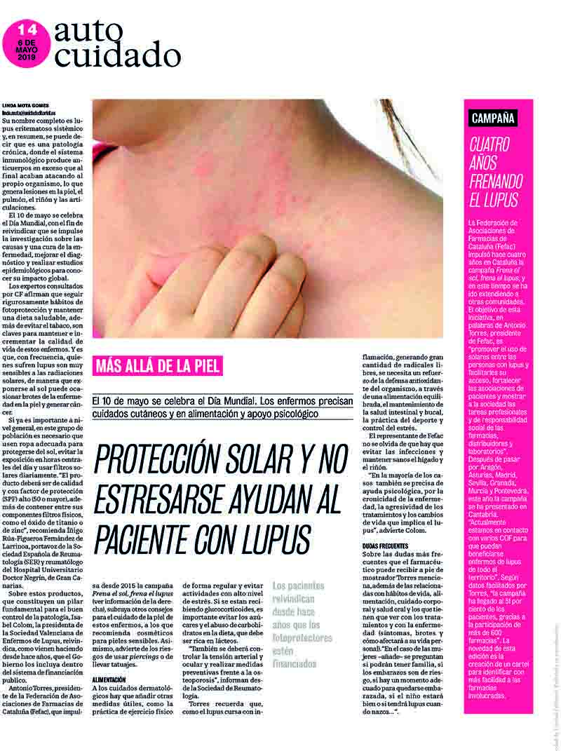 Correo Farmacéutico publica esta semana (del 6 al 12 de mayo) un artículo sobre el lupus «Protección solar y no estresarse ayudan el paciente con lupus». En él, varios expertos, entre ellos Antoni Torres, presidente de Fefac, dan consejos a los pacientes.